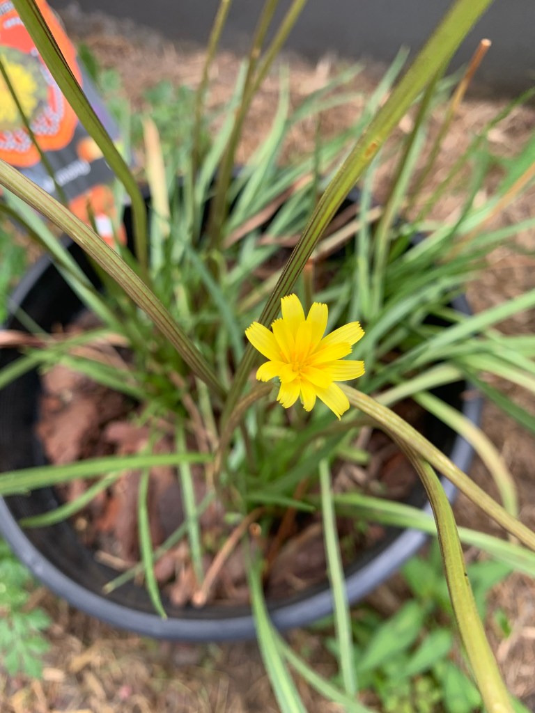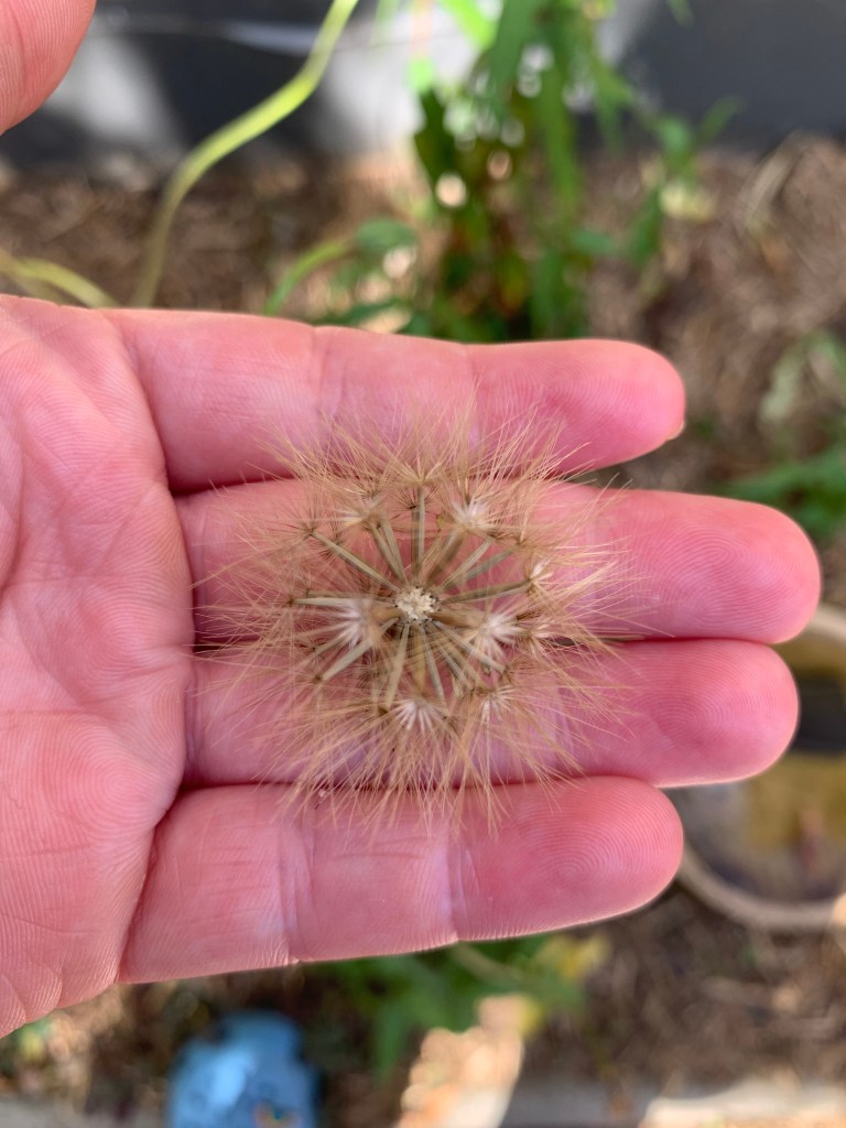 I originally bought a small pot of Murnong from Poynton’s nursery (probably sometime in late 2021 or early 2022), and soon after transplanted it to a bigger pot. When I transplanted it to the larger pot, I separated out some of the pale cream coloured tubers so they had a bit more space. The tubers looked bit like parsnips to me but more like the size of a child’s finger. They have grown well since transplanting, in a semi shaded spot in the garden, and between January and end of March this year the plants have been flowering and producing fluffy seed heads that look similar to dandelions.