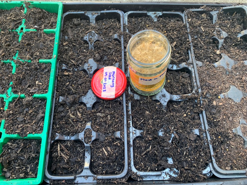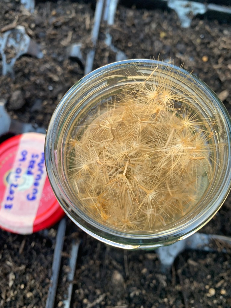 I read online that growing murnong from seed may not be as successful as growing from tubers, but I figured why not give it a go? So I carefully cut off most of the seed heads, one by one, as they appeared, and stored them in a glass jar in the shed. By the end of March I had a full jar of fluffy seeds.