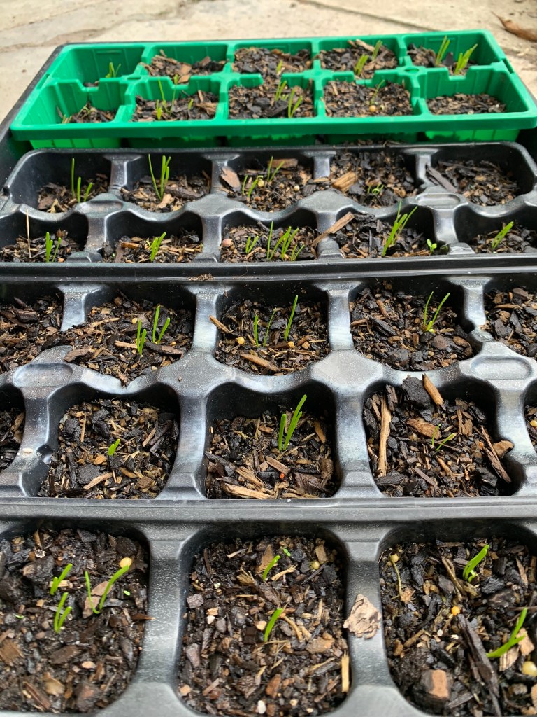 Results so far….At the end of March (28/03/2023) I decided to start my first experiment of growing Murnong from seed. I set up some seedling trays with a mix of potting mix and garden soil, and planted approx. 1-3 seeds per square, just under the surface of the dirt and watered them. There are 40 squares in total. I had no idea what the success rate of germination would be, although this article on the Landcare website suggested propagating by seed might not be super successful, so I tried not to get my hopes up.