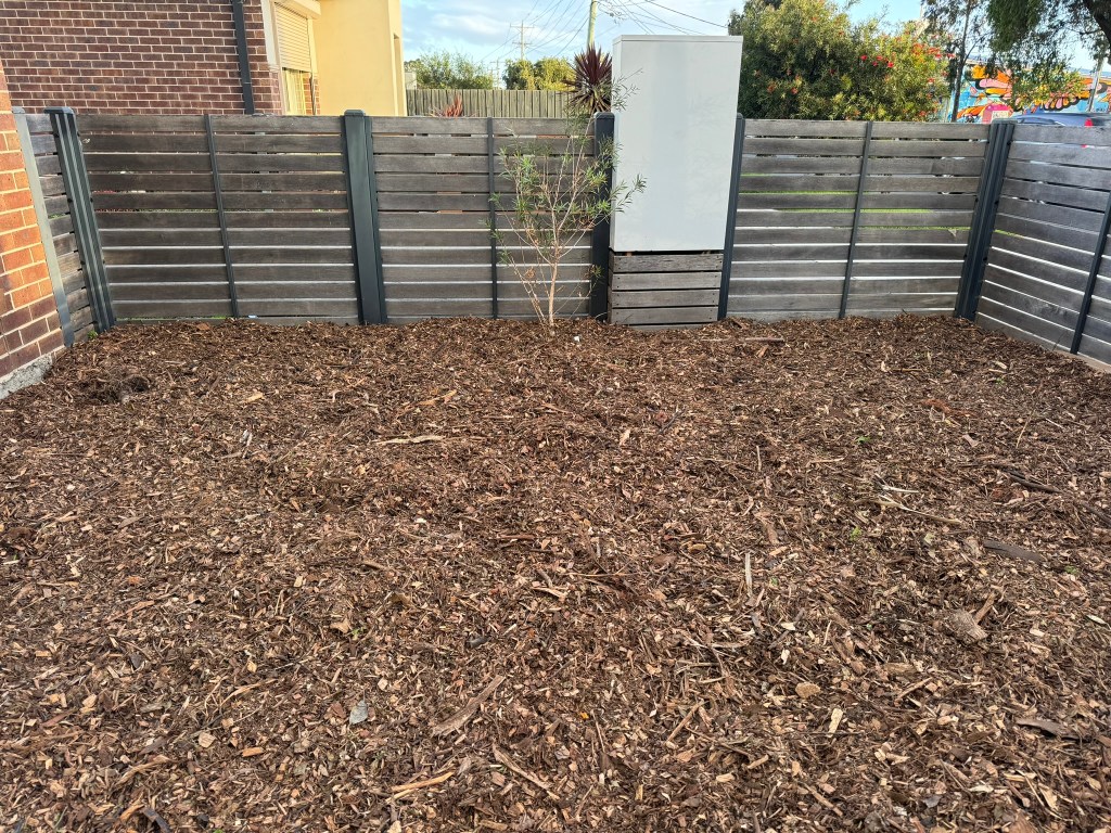 First, we dug out the grass, sugar cane, dying avocado sapling, and the boring hedge plants. The hedge plants were hard work to remove, required a lot of manual labour. Then we had a fairly ‘clean slate’, that we lay cardboard down over the earth, overlapping it as much as possible, then wetting down with water. This we then covered with 5-10cm of mulch. We ordered about 1 cubic metre of ‘bush mulch’ for each 4 x 5 metre section of our garden. This was delivered in a big pile on our driveway in May 2024 and we hand shovelled it to cover the cardboard. This is to try to suppress weeds and grass growing back.
