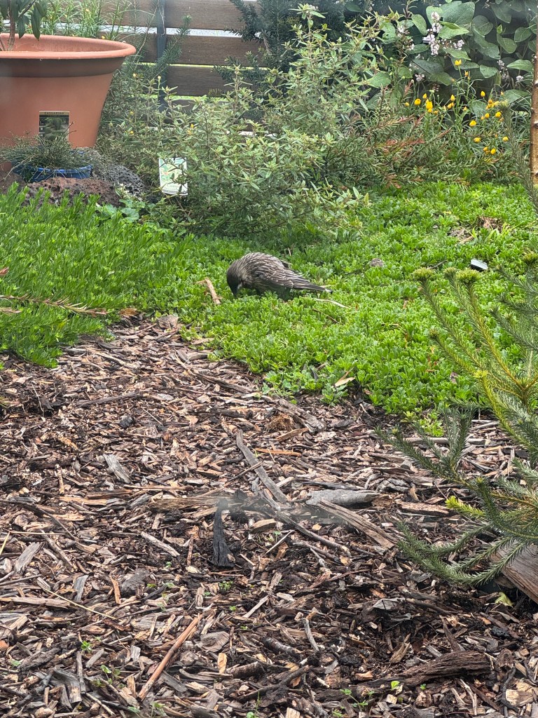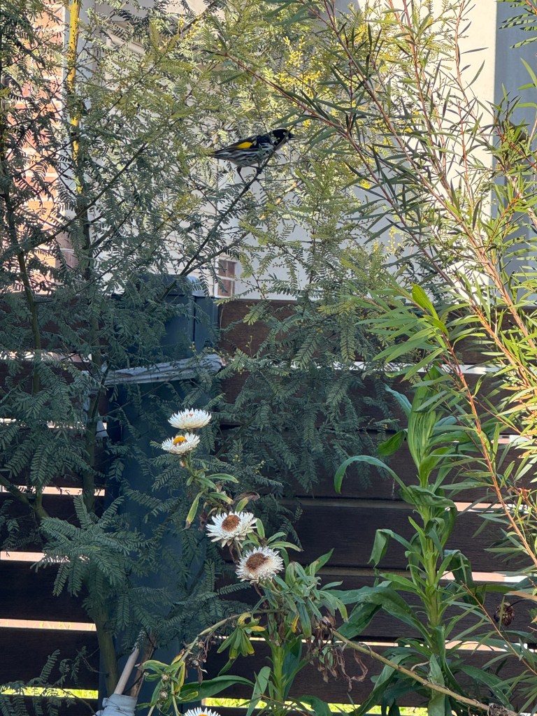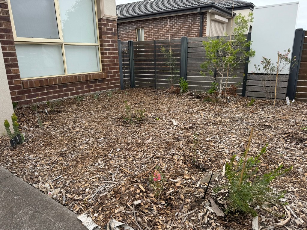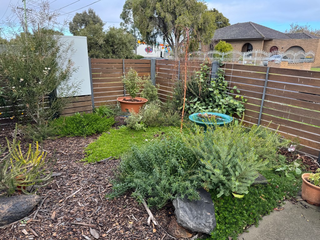 It has been just over a year now since we started establishing the garden. We have quite a good variety of native plants so even in winter there are some flowers for the pollinators. It is Spring 2025 now, and most of the plants are really thriving, covered in new growth and spring flowers. I have seen native insects such as native leaf cutter bees and many hoverflies, and new holland honey eaters frequently visit to use the water bath, and honeyeaters and wattlebirds have been visiting to drink nectar from the flowers, including the eremophila ground cover plants, correa shrubs, and the grevillea bushes. I can’t wait for the banksia, wattle and grevillea shrubs and trees to grow and provide more habitat and hopefully this will attract even more birds to the garden in the coming years. My dream is that one day blue wrens and spotted pardalotes will visit our garden.